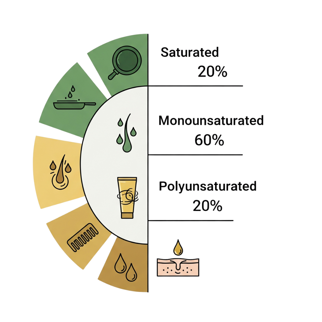 MCT > 56%. Lauric acid = 46% . Full fat profile – Saturated 76 %, Mono unsaturated 13 %, Poly unsaturated 8% Loved for cooking, skin & hair. Full report or simple summary – your choice